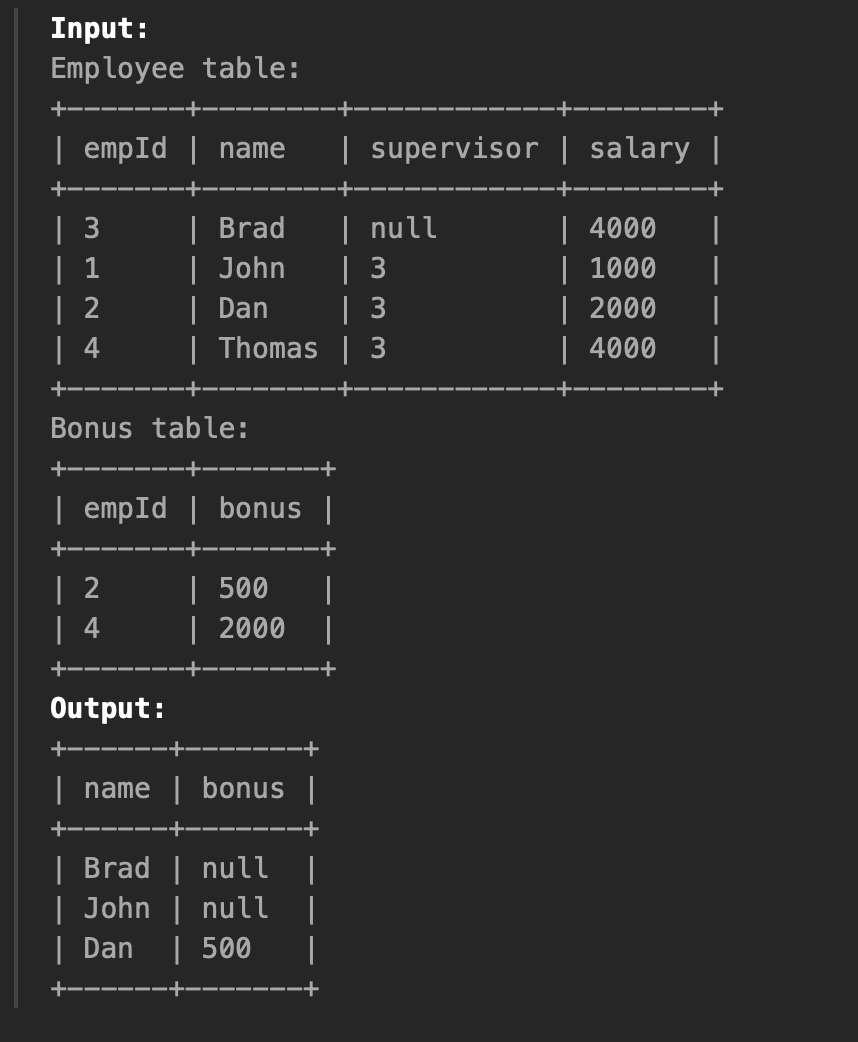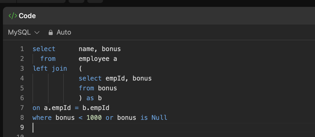 만약 Bonus 테이블에 Null 값도 포함됐다면 원래 내가 작성한 쿼리도 답이 될 수 있었을 것이다.