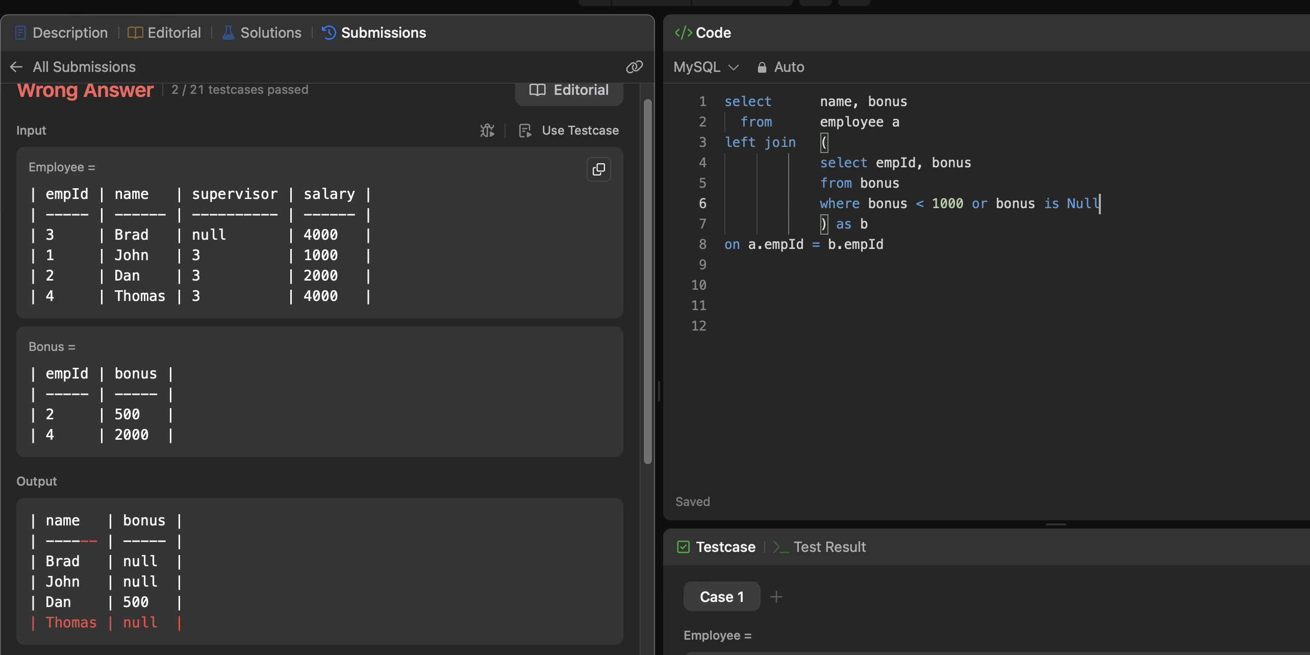 Bonus 테이블에서 걸러졌던 보너스 1000 이상 직원들이 레프트 조인을 하는 과정에서 Null 값 처리되어 결과에 다시 등장했다.