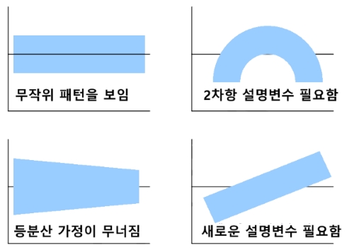- 선형회귀 모델은 이해와 방법이 쉽다는 장점이 있지만 만족해야 하는 조건들이 있다.